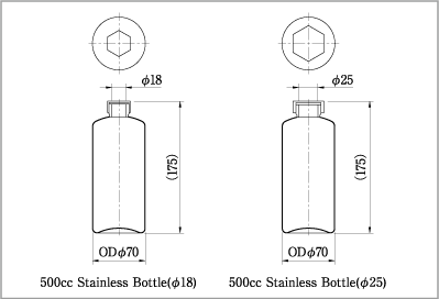500cc  Stainless Bottle(dia.18,dia.25)  Diameter dia.18  Material: SUS304  Surface Treatment:  Inner: Acid Cleaning  Outer: HL Polish  Specification Selection: Gasket  Polyethylene Form  Hi-Sheet  (Low-ratio expanded polyethylene sheet)  EPDM  Viton  Perfluoro-carbon