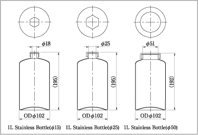 1L  Stainless Bottle(dia.15,dia.25,dia.50)  Diameter dia.15  Material: SUS304  Surface Treatment:  Inner: Acid Cleaning  Outer: HL Polish  Specification Selection:  Gasket  Polyethylene Form  Hi-Sheet  (Low-ratio expanded polyethylene sheet)  EPDM  Viton  Perfluoro-carbon