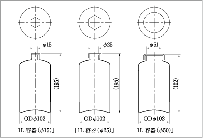 1L容器(φ15、φ25、φ50) 口径:φ15 材質:SUS304 表面処理:内面:電解研磨 外面:HL研磨 [仕様選択] パッキン:□発泡ポリエチレン □ハイシ−ト □EPDM □バイトン □パ−フロ